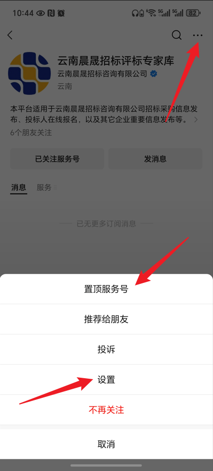 系统默认开启服务号 “消息免打扰”,未解除将无法收到通知响铃提醒,可能影响评标参与!操作步骤如下: