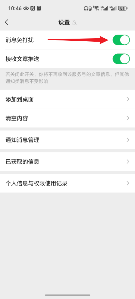 点击 “设置” 进入界面,找到 “消息免打扰” 选项,点击右侧开关将其关闭(关闭后无 “响铃禁用” 斜线图标即为设置成功)。