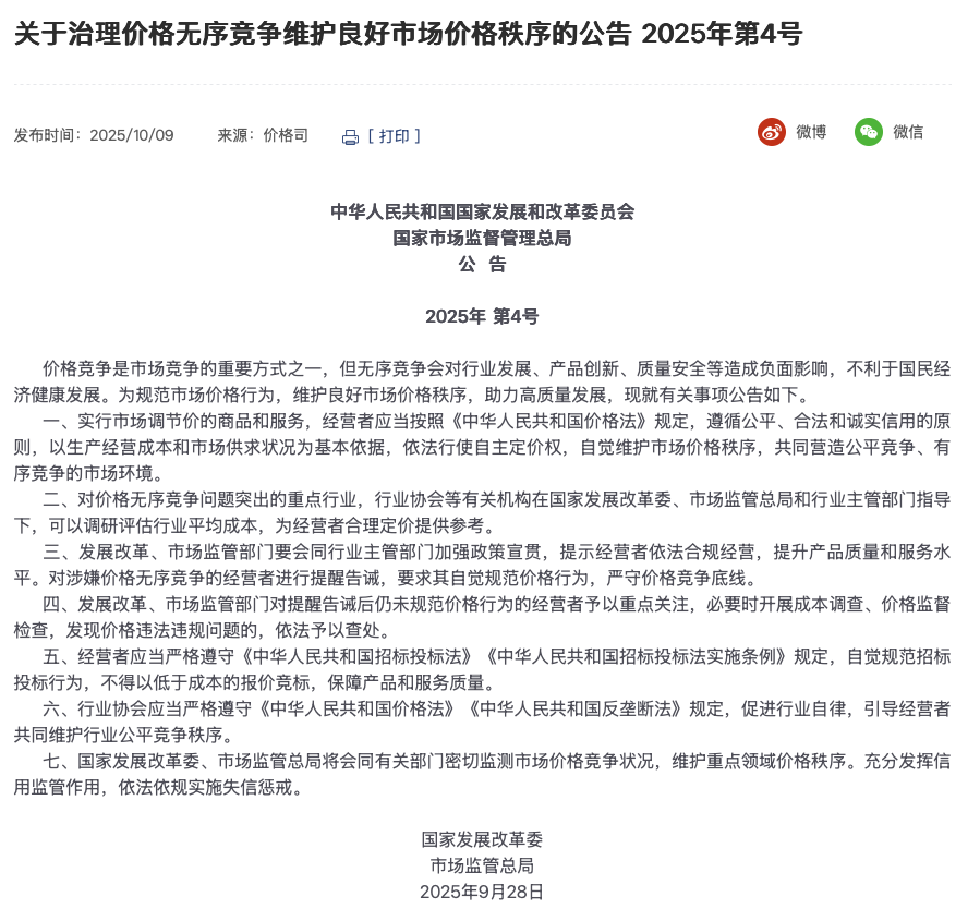 国家发展改革委有关负责人表示,将积极推动行业自律,强化事前引导,充分发挥行业协会作用,推动重点企业带头遵守法律法规要求,自觉规范价格行为。同时,强化市场监测,密切监测市场价格运行情况和行业竞争状况,及时发现价格无序竞争问题线索。此外,加强监管执法,落实好《公告》提出的监管措施,依法查处价格违法行为,维护公平竞争市场环境。