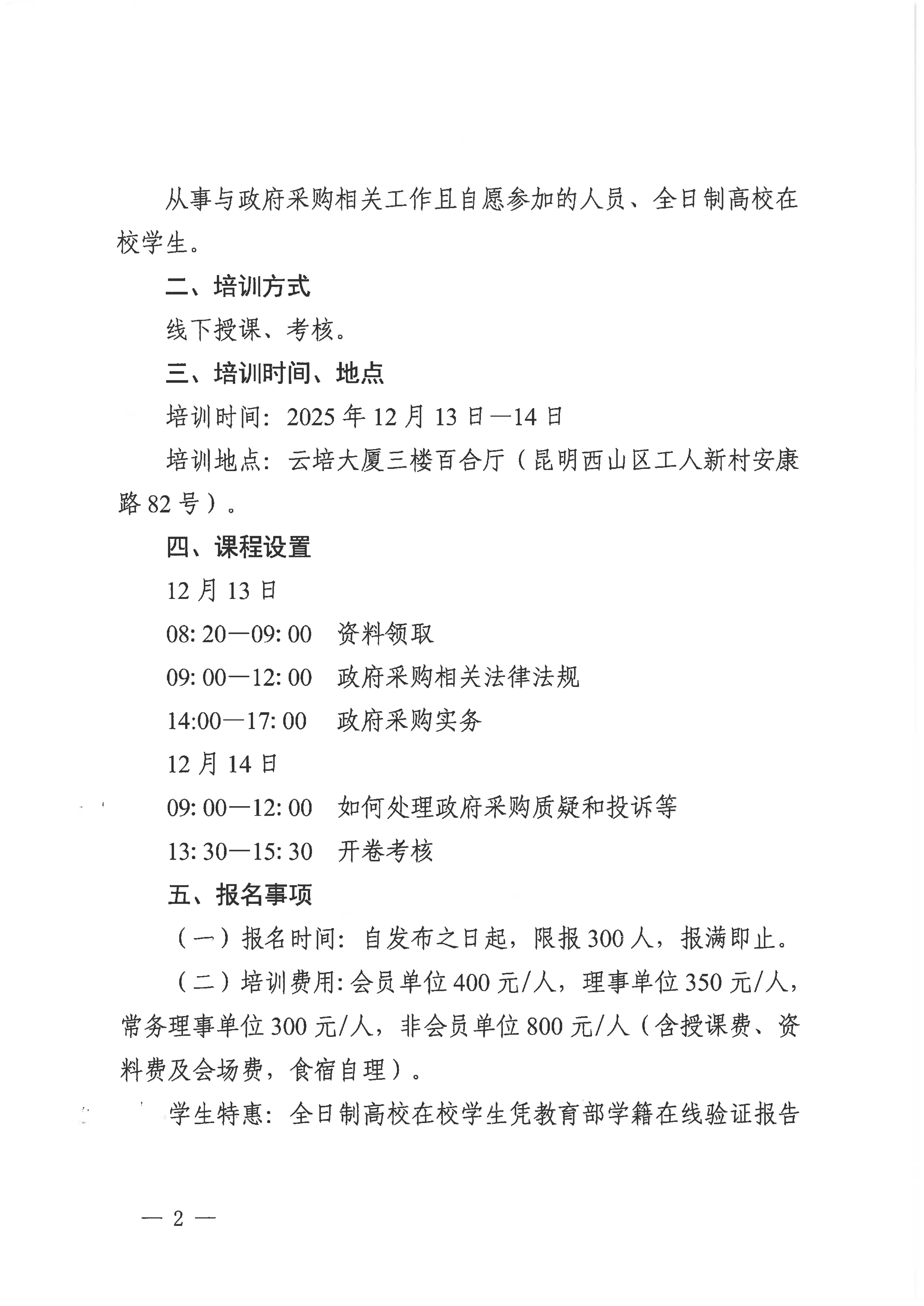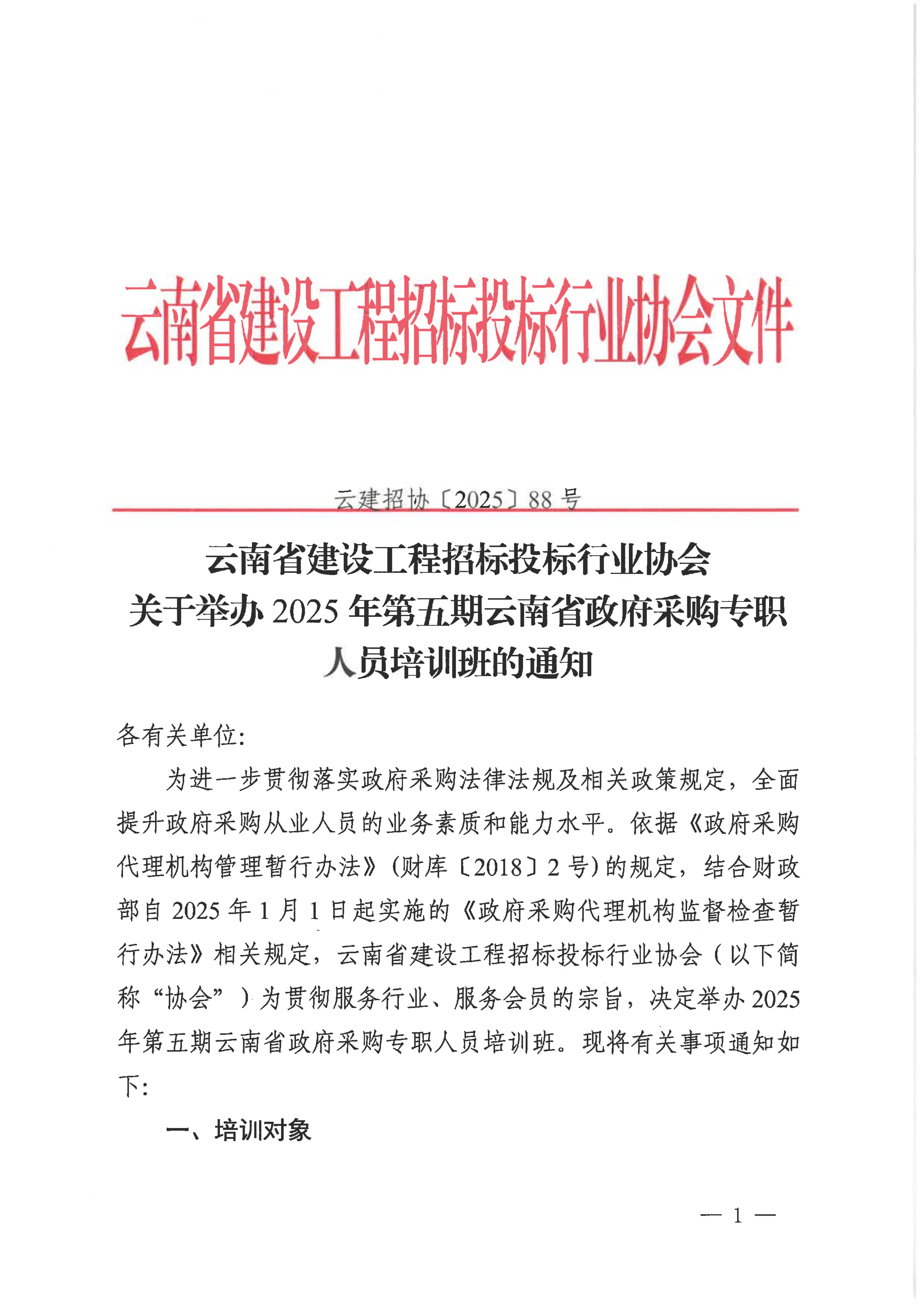 云南省建设工程招标投标行业协会关于举办2025年第五期云南省政府采购专职人员培训班的通知